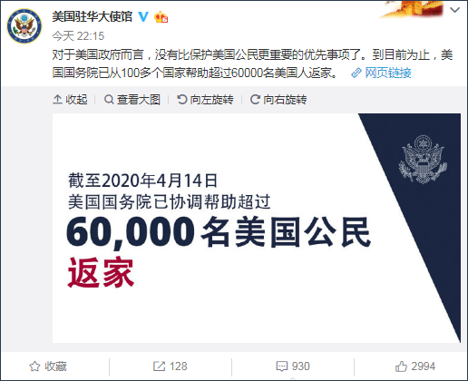 @美國駐華大使館 4月15日發微博,聲稱對於美國政府而言,沒有比保護美國公民更重要的優先事項了。到目前為止,美國國務院已從100多個國家幫助超過60000名美國人返家。