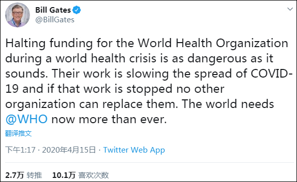 比爾·蓋茨在社交媒體上發聲:“WHO的工作就是減緩新冠肺炎的傳播速度,如果這項工作被停止,那就沒有其他組織能頂上了。現在,世界比以往任何時候都更需要WHO。”