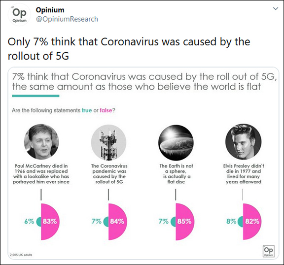 英國民調網站Opinium採訪了2005名英國民眾,在關於“新冠是不是由5G引起”這個問題上,2005人中有151人認為新冠確實或可能由5G引起,佔調查人數的7%。