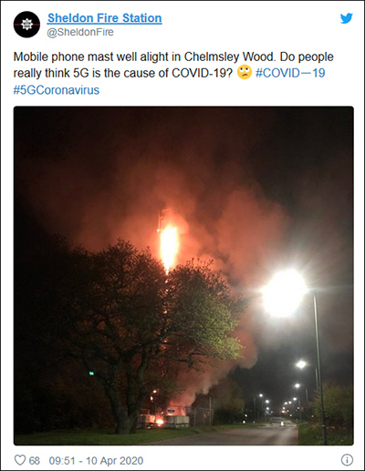 據《衞報》14日報道,就在英國上週建成的**方艙醫院——**南丁格爾醫院附近,基站也遭到縱火。負責該地區的謝爾頓消防站也無奈地表示,“難道人們真相信5G會引起新冠?”