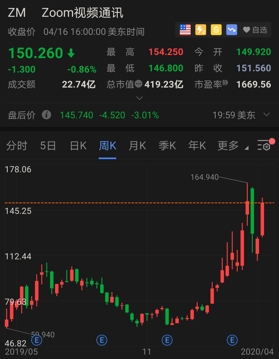 雖然其股價在4月有所回落,但隨後又重新上升。截至4月16日收盤,Zoom股價報150.26美元/股,接近歷史高位。