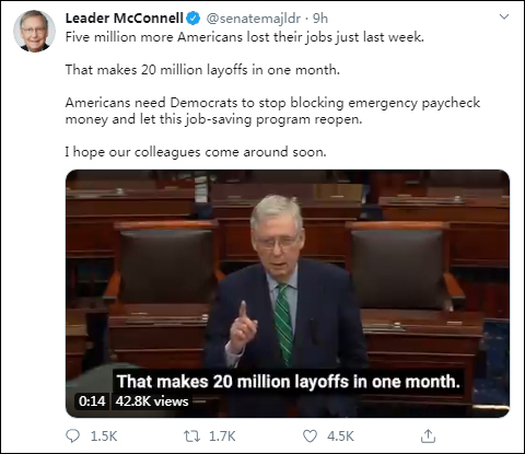 參議院共和黨領袖麥康奈爾喊話,每週都有數百萬美國人失業,令人心碎。而自己從上週就發出警告,如今民主黨眼睜睜看着貸款用盡,卻還在阻止投票。他們不願援助工人與小企業的做法是“超現實的”(surreal)。“美國人民需要民主黨停止阻撓緊急發薪,並重啓這個拯救工作崗位的項目。”