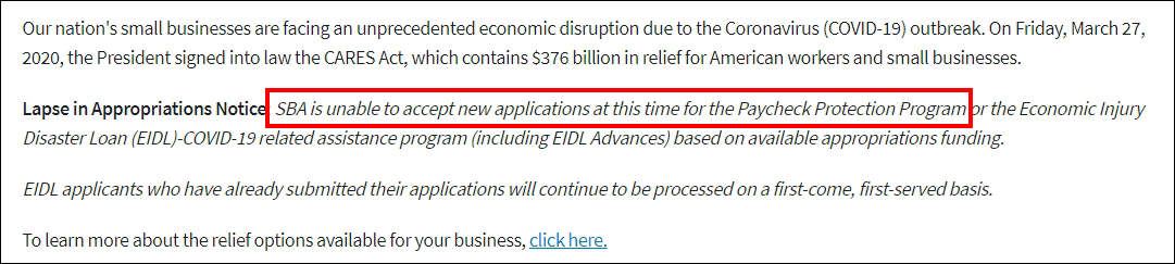 美國小企業管理局表示,將不再接受新的借貸申請 截圖:SBA官網