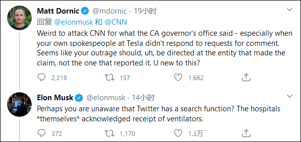4月16日,CNN發佈了一篇報道稱,在馬斯克表示向加州醫院捐贈1000多台呼吸機三週後,該州州長辦公室表示醫院沒有收到任何呼吸機。而特斯拉發言人也沒有回應置評請求。