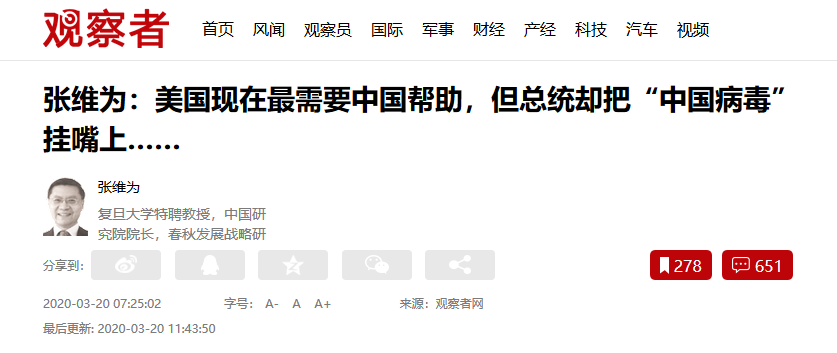 **張維為:**我覺得美國的政治人物第一是不負責任,第二是想甩鍋。因為他們這次抗疫整個舉措確實是進退失據、非常狼狽,想把這個罪名放到中國身上。特朗普後來改口不説“中國病毒”了,蓬佩奧還在堅持,背後是美國實力的直線下滑。七國集團外長會議,通不過這個東西,最後沒有會議公報,另外六個國家都不同意,就説明美國已經沒有實力來左右這個局面。所以道理非常簡單,無論從事實考證,還是從科學研究,還是政治態度來説,美國的立場都站不住腳的。所以我們對於這樣的觀點應該迎頭痛擊。