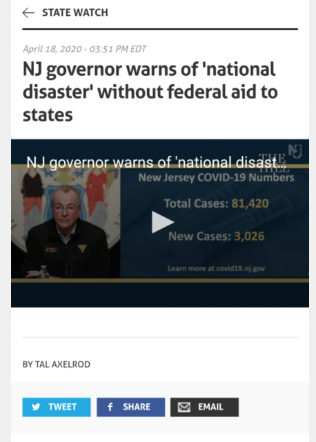 美國新澤西州州長:聯邦政府不加大財政援助 可能導致全國性災難