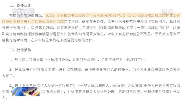 事件發生後,中國科學院南海海洋研究所連續發佈通告,成立調查組對相關情況開展調查,並在最新的調查處理情況的説明通告中明確,認定涉事報告書部分內容,與研究所編寫的《湛江港30萬噸級航道改擴建工程環境影響報告書》定性分析部分相同或高度相似,確實存在抄襲。研究所已中止參與這一項目合同,對相關責任人啓動問責程序。各級主管部門已介入調查,項目的建設工作也已暫停。
