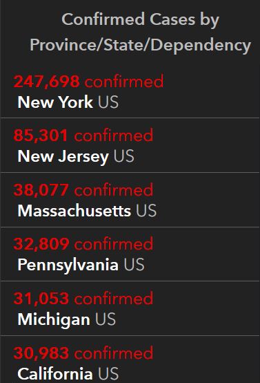 在疫情最為嚴重的紐約州,19日累計確診達到247698例,累計死亡18298例。其次是新澤西州,累計病例已達85301例,累計死亡4362例。