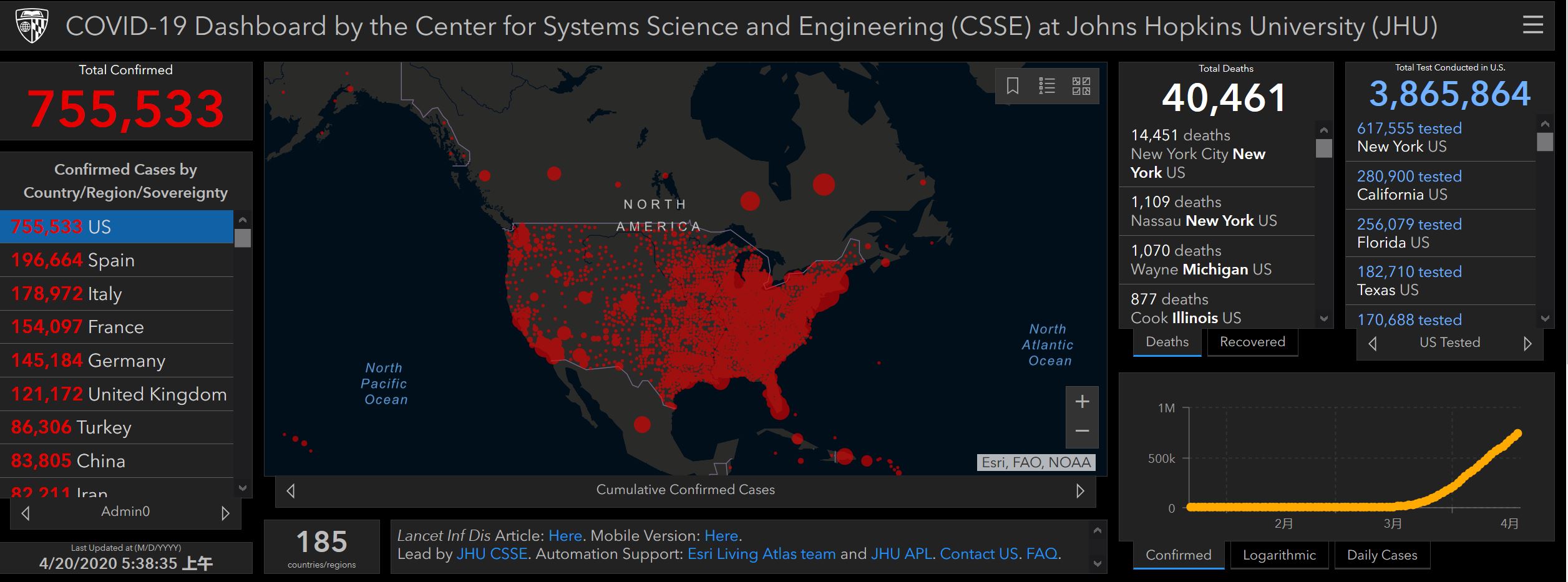 據美國約翰斯·霍普金斯大學發佈的全球新冠肺炎數據實時統計系統,截至美國東部時間4月19日晚5時38分(北京時間4月20日早上5時38分),全美共報告新冠肺炎確診755533例,死亡40461例,共檢測3865864例。在過去約24小時,全美新增確診28888例,新增死亡1797例。