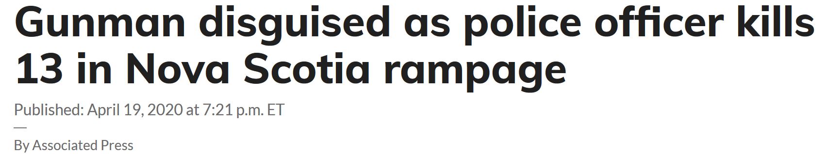 (觀察者網訊)據美聯社當地時間4月19日傍晚消息,加拿大警方在新斯科舍省首府哈利法克斯舉行新聞發佈會,宣佈週日一名身穿警服的男子在加拿大新斯科舍省駕車途中開槍射擊,導致13人死亡,其中包括一名23歲的女性警察。