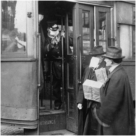 在1918年流感大流行期間,西雅圖的一名有軌電車售票員和乘客戴着口罩。