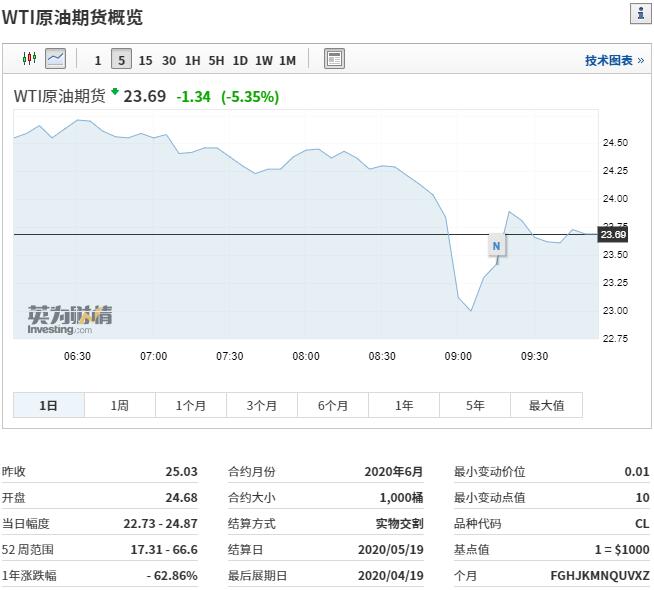 WTI原油的6月期貨價格也出現了下跌。6月期貨今日開盤後曾一度跌至23美元/桶,截至發稿,價格為23.7美元/桶,跌幅達到5.19%。