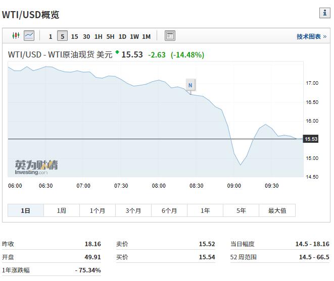而WTI原油現貨今日開盤後一度跌至14.82美元/桶,截至發稿,價格為15.52美元/桶,跌幅達14.54%。