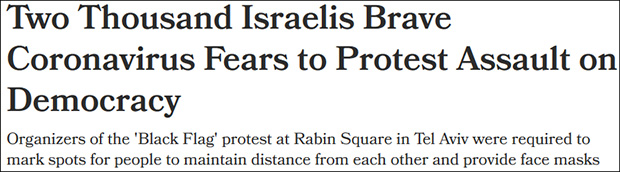 為抗議內塔尼亞胡的政策,3月起就有數百輛汽車開往耶路撒冷,發起了“黑旗”(Black Flag)抗議活動,反對這一系列“反民主政策”。