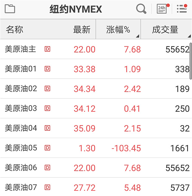 21日開盤後,5月原油合約已上漲約109%,現報1.3美元/桶,主力6月合約漲7.68%,現報22美元/桶。