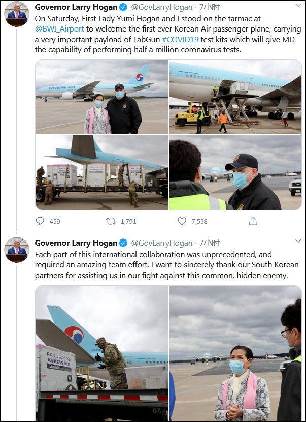 據美國有線電視新聞網(CNN)4月21日報道,一架載有50萬新冠肺炎檢測試劑盒的大韓航空包機18日抵達馬里蘭州的巴爾的摩-華盛頓國際機場,州長夫婦親自來到機場接貨。