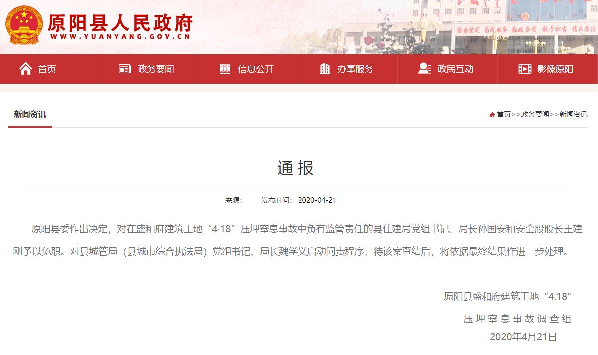 據河南原陽縣政府官網4月21日發佈通報,原陽縣委作出決定,對在盛和府建築工地“4·18”壓埋窒息事故中負有監管責任的縣住建局黨組書記、局長孫國安和安全股股長王建剛予以免職。對縣城管局(縣城市綜合執法局)黨組書記、局長魏學義啓動問責程序,待該案查結後,將依據最終結果作進一步處理。