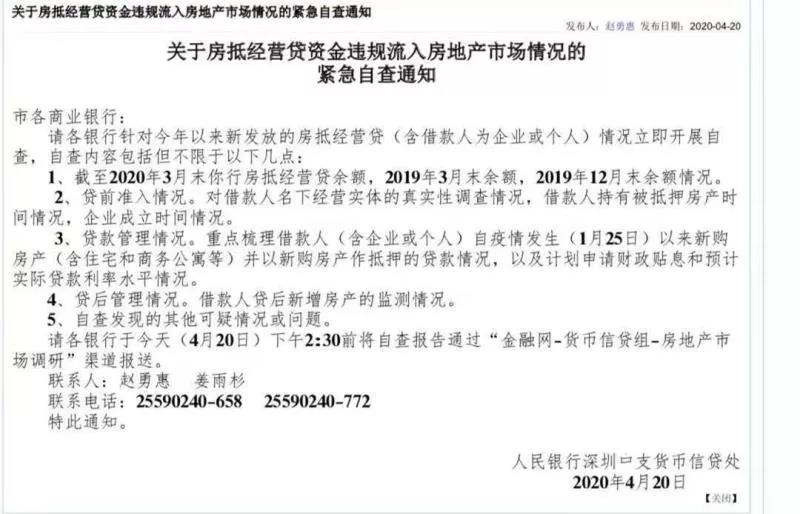 日前有消息稱,中國人民銀行深圳市中心支行下發通知,要求各商業銀行緊急自查房抵經營貸資金違規流入房地產市場情況。該通知,要求深圳各家商業銀行自查截至3月末,所發放的房抵經營貸餘額,包括貸前、貸中、貸後等情況。
