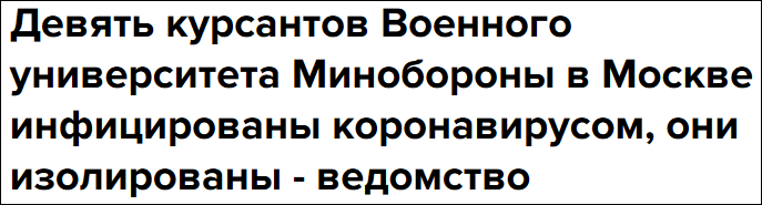 據俄羅斯國際文傳電訊社(Interfax)21日援引俄羅斯聯邦國防部的消息,俄羅斯軍事大學中有9名學員被檢測出感染新冠肺炎。目前,這9人已經被隔離治療,情況都很穩定。