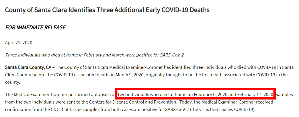聖克拉拉縣首例死亡原本被認為出現在3月9日,是一位2月中旬確診的68歲婦女。衞生部門當時並未找到其感染源頭,視為當地出現的首例社區感染。4月12日,聖克拉拉縣縣長、醫學博士傑夫·史密斯判斷,該縣可能去年12月就出現了疫情。