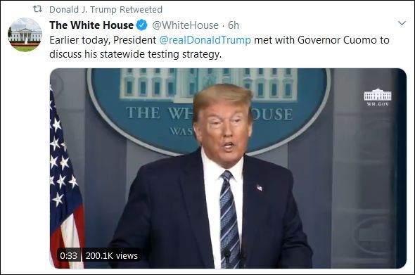 白宮推特21日稱,當天早些時候特朗普與科莫會面,討論州範圍內的檢測問題