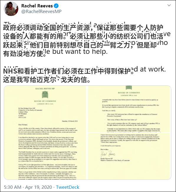 影子內閣大臣瑞秋·麗芙斯(Rachel Reeves)週二(21日)在社交媒體上表示,有許多生產商/供應商向她反映,説它們聯繫了政府,想要提供個人防護設備,但是消息石沉大海。