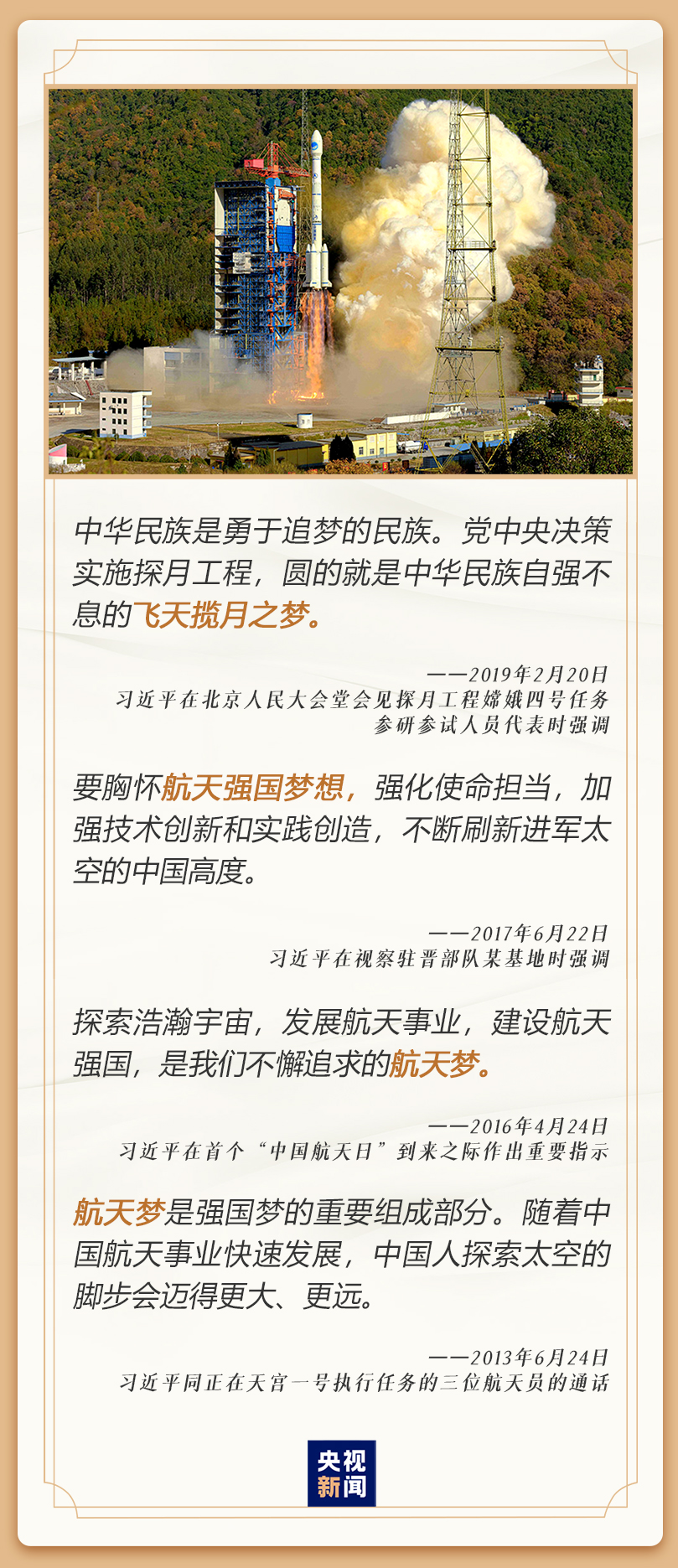 “偉大事業都始於夢想”“偉大事業都基於創新”“偉大事業都成於實幹”,習近平的殷殷囑託,為我國航天事業發展提供了根本遵循和前進方向。
