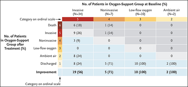 4月10日《新英格蘭醫學雜誌》刊登的一個研究結果則顯示,在對61名重症患者使用瑞德西韋的臨牀試驗中,取得53人的完整數據。在這53名患者中,總計36人(68%)症狀有改善,8人症狀惡化,其中7人(13%)死亡。最終25人出院。不過文章作者也指出,這項研究沒有采集病毒負荷的數據,患者數目也不多,隨訪時間短,有一定的不足。