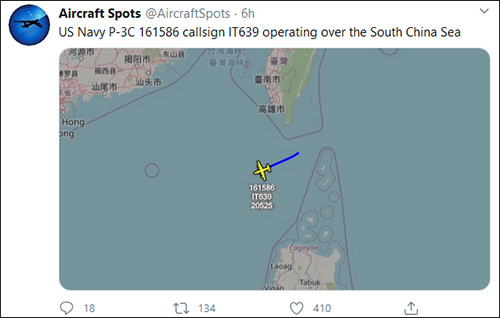 (觀察者網訊)據台灣“中央社”等媒體4月25日報道,長期追蹤軍事飛行器動向的推特“飛機守望”(Aircraft Spots)25日在社交媒體公佈,一架美軍P-3C反潛機航經巴士海峽,由東北向西南朝南海飛行。