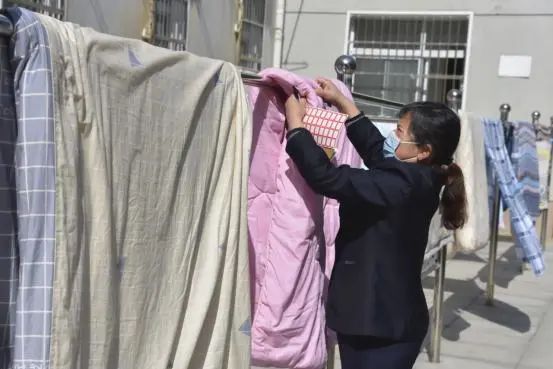 考慮到很多學生不希望在沒有經過本人同意的情況下被碰觸私人物品,因此各個宿舍樓棟的宿管員首先通過微信羣或QQ羣與同學們進行溝通。徵詢了大家的同意後,宿管員把同學們的被褥等牀上用品拿到宿舍樓下的曬衣繩上晾曬。