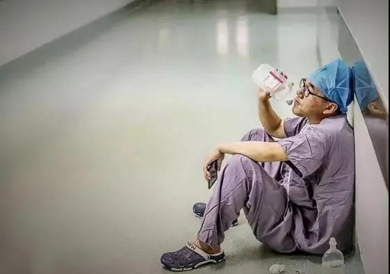 長時間工作的醫生因為低血糖正在喝葡萄糖生理鹽水,2016年(圖/人民網)