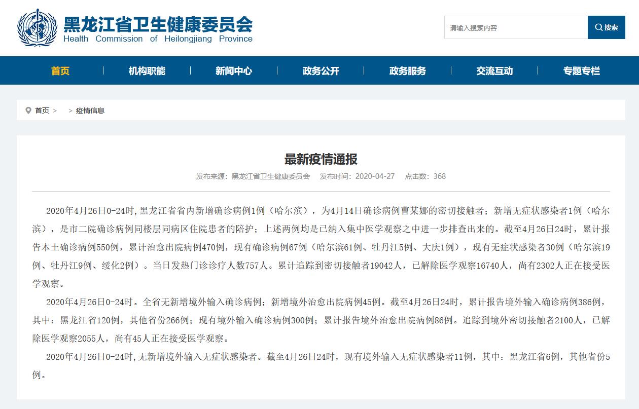 據黑龍江省衞生健康委4月27日通報,4月26日0-24時,黑龍江省省內新增確診病例1例(哈爾濱),為4月14日確診病例曹某娜的密切接觸者;新增無症狀感染者1例(哈爾濱),是市二院確診病例同樓層同病區住院患者的陪護;上述兩例均是已納入集中醫學觀察之中進一步排查出來的。截至4月26日24時,累計報告本土確診病例550例,累計治癒出院病例470例,現有確診病例67例(哈爾濱61例、牡丹江5例、大慶1例),現有無症狀感染者30例(哈爾濱19例、牡丹江9例、綏化2例)。當日發熱門診診療人數757人。累計追蹤到密切接觸者19042人,已解除醫學觀察16740人,尚有2302人正在接受醫學觀察。