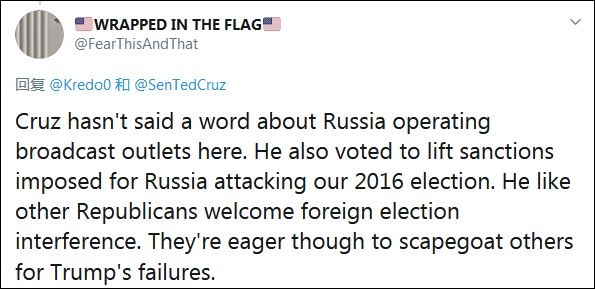 例如,其中一名網友指出,俄羅斯也在美國運營新聞機構,但克魯茲“什麼也沒説”。而在當年美國熱炒的“俄羅斯干預大選”議題中,他也沒有反對。因此,克魯茲的所作所為,是在為特朗普的失敗尋找“替罪羊”。