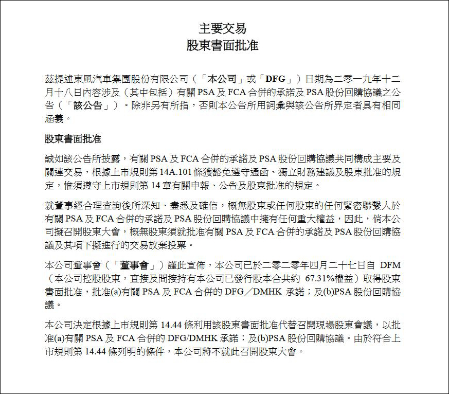 4月27日,東風汽車集團宣佈,有關標緻雪鐵龍集團(PSA)及菲亞特克萊斯勒汽車(FCA)合併及PSA集團股份回購協議已取得股東書面批准。