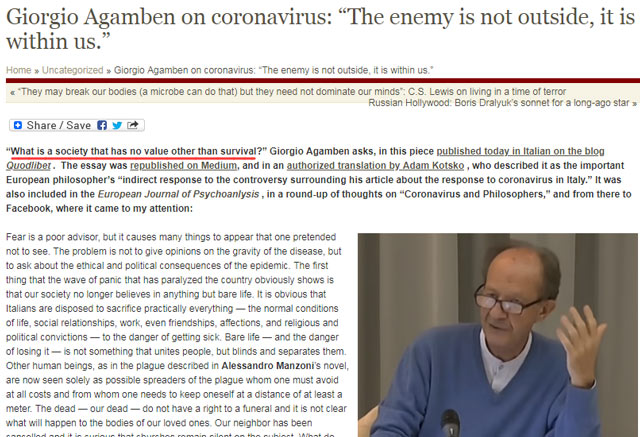 在意大利哲學家、對“例外狀態”(State of exception)頗有研究的阿甘本(Giorgio Agamben)眼裏,政府對病毒“歇斯底里的反應”,特別是禁足規定,説明“新自由主義”除了權力和赤裸裸的生存之外,其實是什麼都不信的。他説,在這方面,意大利就是展現在世界面前的一個活標本:在一個不再思考“究竟”的現代社會里,人類的生活其實已降低到“活下去”的水準上了。換而言之,人們所有的行為,只是為了生物意義上的“生存”。所以,疫情一旦造成恐慌,人們首先擔心會失去生存的機會,因而不惜犧牲“自由”。