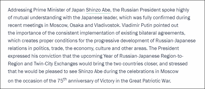2019年12月30日,在普京發給安倍晉三的新年賀電中,普京提到:俄方高度認同兩國近期達成的共同認識,期待今年兩國繼續深化雙邊合作。賀電最後還特別提到:將很高興看到安倍晉三出席今年5月的衞國戰爭勝利75週年慶典。