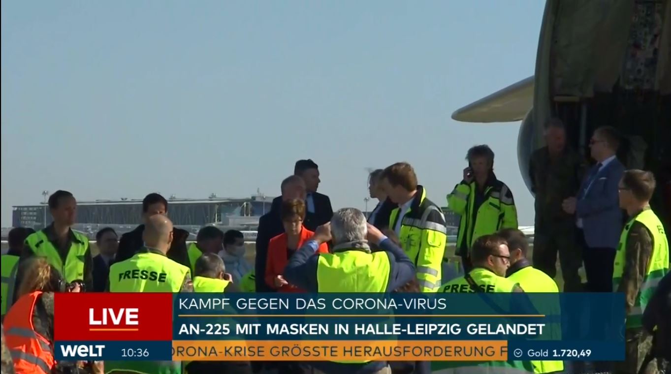 4月27日,世界最大的在運飛機安-225(Antonov-225)型大型運輸機從中國飛抵德國,機上滿載着德國政府為應對新冠肺炎疫情從中國採購的1000萬隻防護口罩。