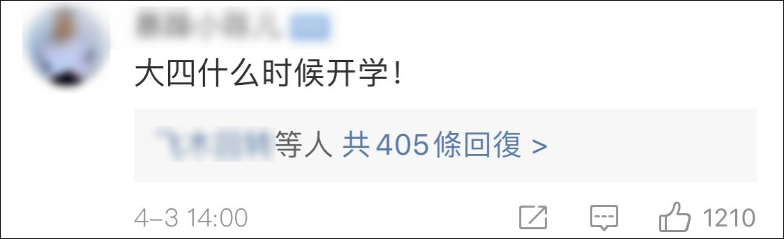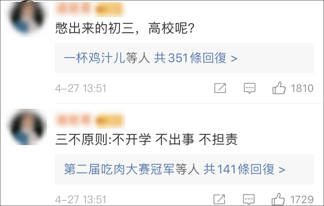 @山東省教育廳 4月3日宣佈高三於4月15日開學的微博下,同樣有許多網友催開學。