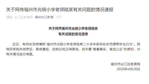 4月28日,福州市台江區教育局通過其官方微信公眾號@福州台江教育發佈通報:近日,有網友發微博稱“福州市光明小學老師陸某二十多年前存在體罰猥褻學生行為”。我局獲悉相關信息後,高度重視,目前已成立調查組,將本着“尊重事實、客觀公正”的原則,對有關情況進行調查。