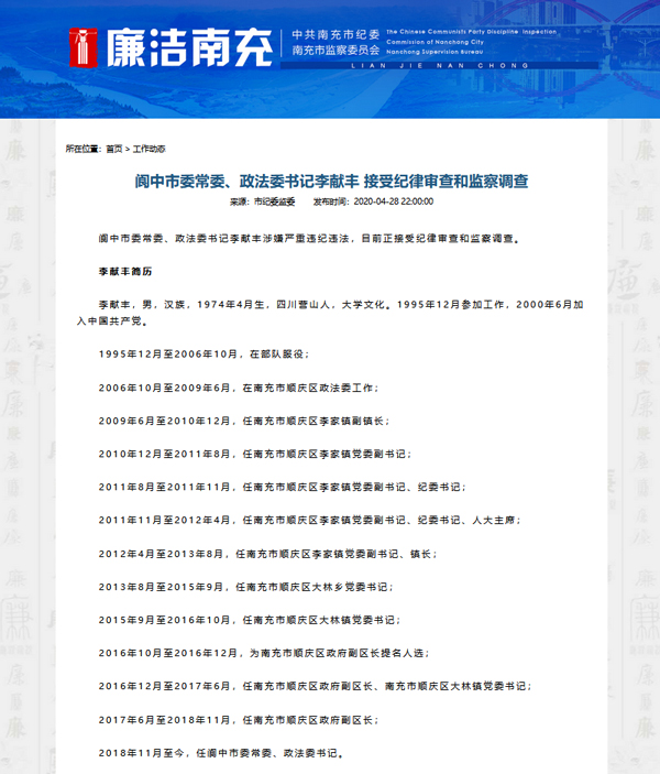 公開的資料顯示,李獻豐於1974年4月出生,2006年從部隊轉業至南充市順慶區政法委,先後出任順慶區政法委執法督察督辦室主任、順慶區李家鎮副鎮長等職務。2016任順慶區政府黨組成員、大林鎮黨委書記、區政府副區長等職。目前是南充閬中(縣級市)市委常委、政法委書記。