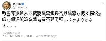 孫正義在推特上説,由於政府的緊急聲明的缺陷,檢測和隔離措施實施得太慢,導致疫情不必要地擴大化了。他説,那些無症狀感染者繼續在火車和公共汽車通勤,有可能存在家庭內感染的可能性。