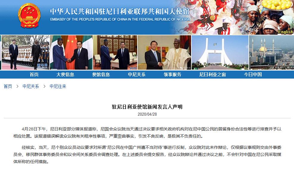 據中國駐尼日利亞大使館網站消息,4月28日下午,尼日利亞部分媒體報道稱,尼國會眾議院當天通過決議要求相關政府機構對在尼中國公民的居留身份合法性等進行排查並予以相應處置。對此,中國駐尼日利亞使館新聞發言人發佈聲明表示,該報道錯誤解讀眾議院有關程序性事項,嚴重歪曲事實,引發不良反響,是極其不負責任的。