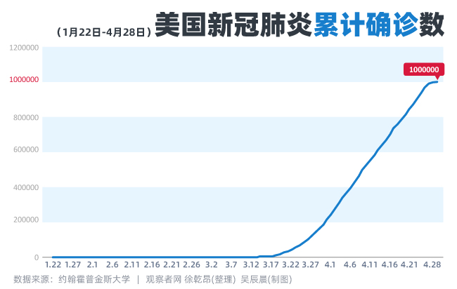 當地時間4月28日,美國新冠肺炎累計確診病例數突破100萬,佔世界總病例數的三分之一,令全球任何一個國家都望塵莫及。