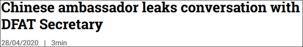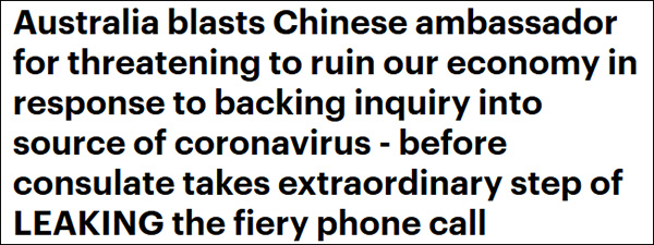 《每日郵報》標題:“領事館泄露通話前:澳方指責中國大使威脅破壞經濟,以回應澳方支持新冠源頭調查”
