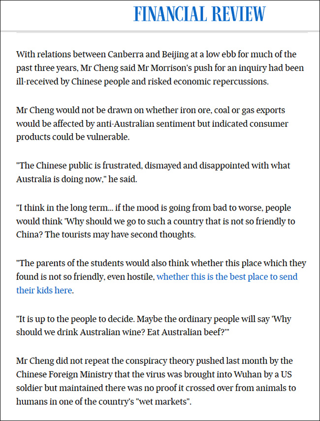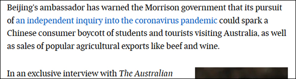 “中國大使警告莫里森政府,其對新冠的獨立調查可能引發中國消費者抵制到澳大利亞的留學旅遊,及牛肉、葡萄酒等受歡迎的農產品出口銷售。”