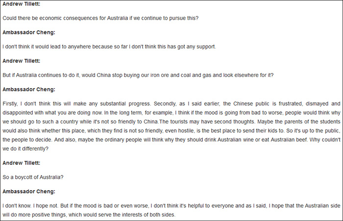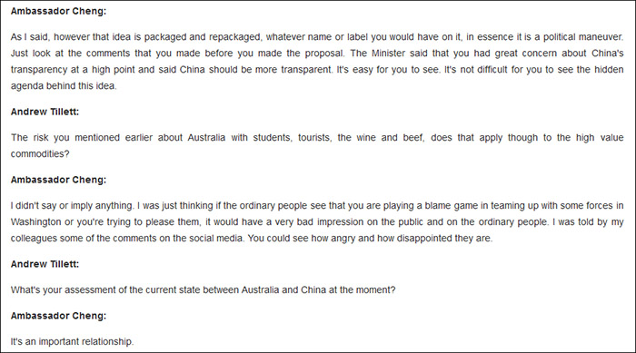 觀察者網發現,中國駐澳大利亞大使館英文版網站27日已經公開了採訪的完整對話內容。
