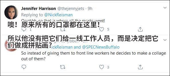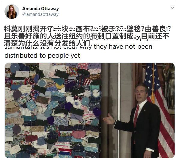 這本是紐約抗疫戰中的温暖一幕,但科莫揭開這幅“美國自畫像”後,還是有一些網友開始質疑:為什麼這些口罩要做成藝術品,而不是送給缺口罩的紐約人呢?