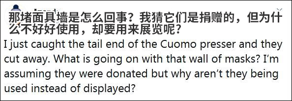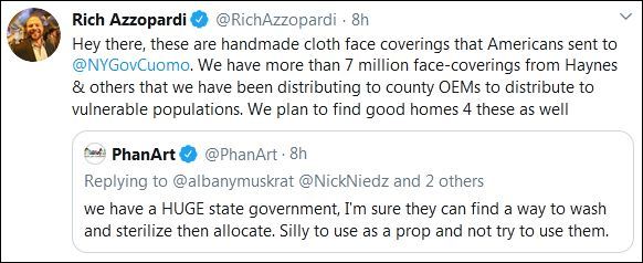 面對這些質疑,州長發言人裏奇·阿佐帕爾迪在推特上回應表示,這些是美國人寄給科莫的手工布口罩。而來自海恩斯和其他公司的“700多萬個口罩”,已經分發給紐約州的弱勢羣體。