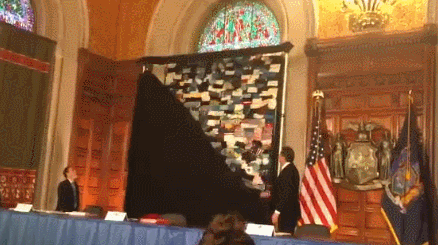 他拉下幕布,展現在大家眼前的是一面花花綠綠的巨大的“口罩牆”。這些口罩來自美國各地民眾對紐約州的捐贈,科莫站在這些口罩邊對記者説:“我想給你們看一幅美國人的自畫像,這是美國的自畫像。”