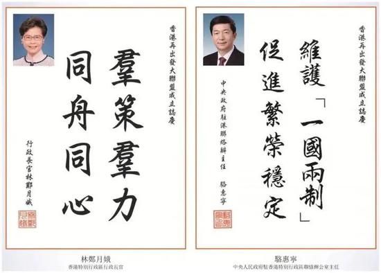 香港特區行政長官林鄭月娥、香港中聯辦主任駱惠寧分別為“香港再出發大聯盟”成立題詞(圖源:香港中聯辦)